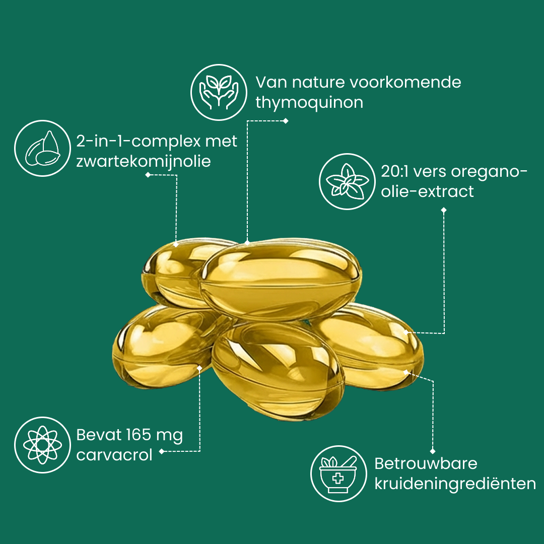 Geen onderdoseerde ingrediënten of valse beloftes. Alleen bewezen doseringen van oregano olie (6.000 mg) en zwarte zaadolie (2.500 mg) - precies zoals het werkt.